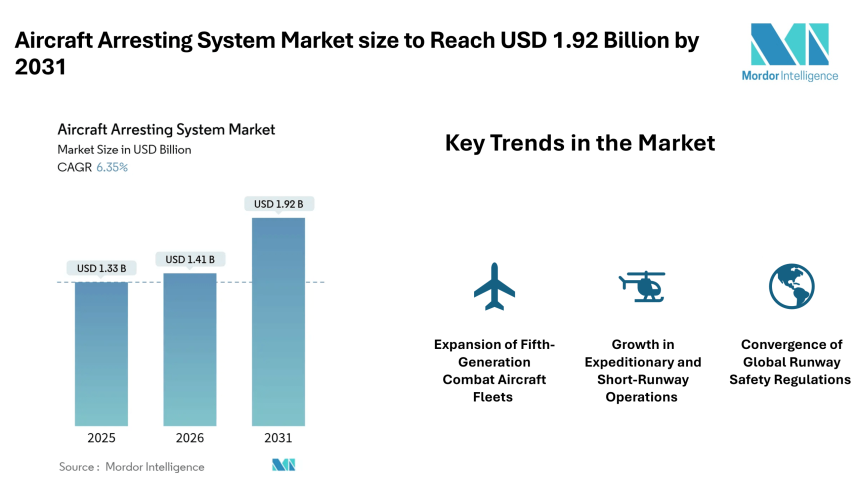 According to Mordor Intelligence, the aircraft arresting system market size was valued at USD 1.41 billion in 2026 and reach USD 1.92 billion by 2031, registering a CAGR of 6.35% during the forecast period. The aircraft arresting system market size is supported by rising investments in advanced fighter aircraft, aircraft carrier modernization programs, and stricter runway safety requirements across commercial airports.