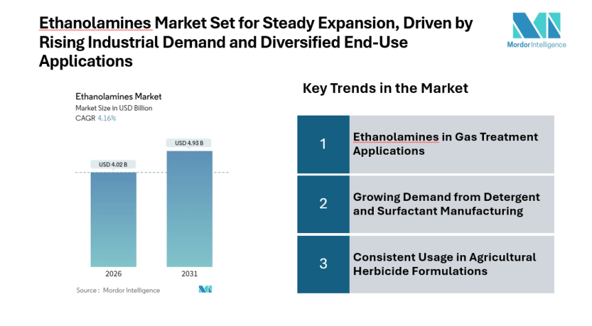The ethanolamines market size was valued at $ 4.02 Billion in 2026 and is projected to reach USD 4.93 Billion by 2031, growing at CAGR of 4.16%. Ethanolamines are key intermediates in herbicide and agrochemical formulations – demand here is rising with global agricultural productivity needs. There’s a growing trend toward bio-based ethanolamines and greener production routes, partly due to environmental policies and consumer demand for sustainable chemicals.