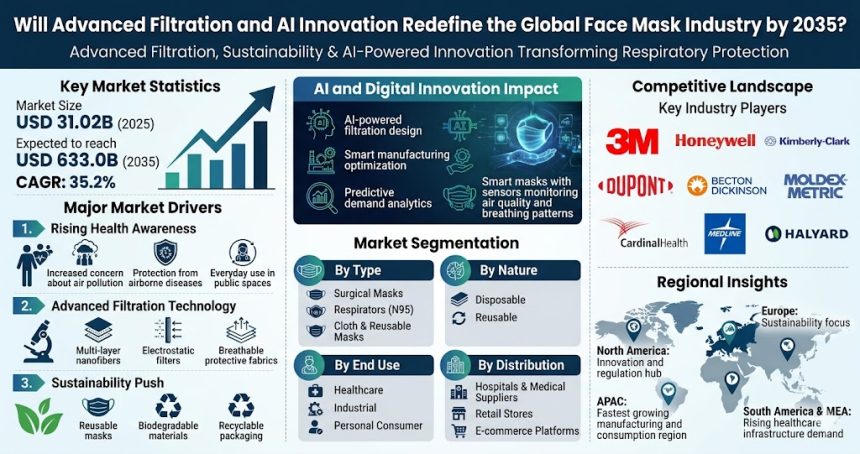 The global Face Mask Market is on a remarkable growth trajectory, poised to expand from a market size of USD 31.02 billion in 2025 to an astounding USD 633.0 billion by 2035, registering a compound annual growth rate (CAGR) of 35.2% during the forecast period of 2025–2035. This unprecedented surge is fueled by rising consumer awareness, increasing health consciousness, and the continuous integration of advanced filtration technologies that enhance mask performance and usability.